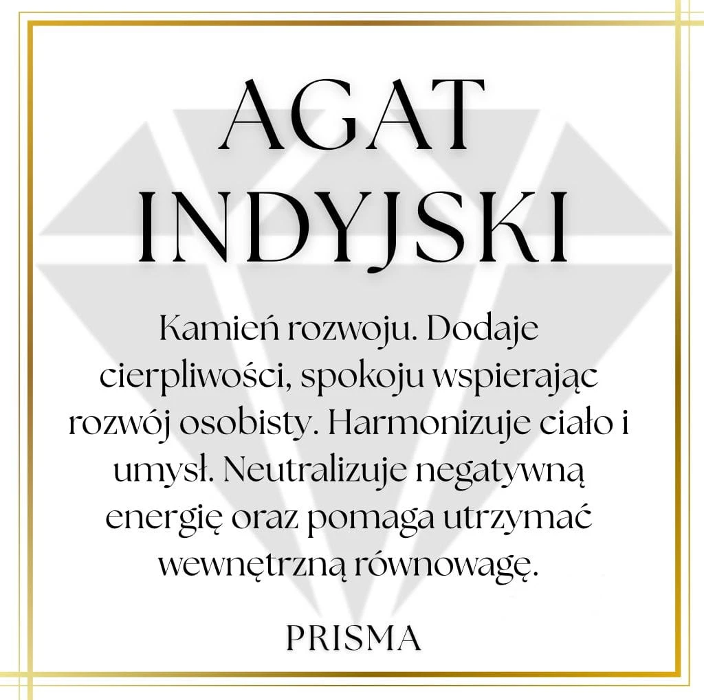 Agat indyjski to kamień rozwoju. Dodaje cierpliwości i spokoju wspierając rozwój osobisty. Harmonizuje ciało i umysł. Neutralizuje negatywną energię oraz pomaga utrzymać wewnętrzną równowagę.