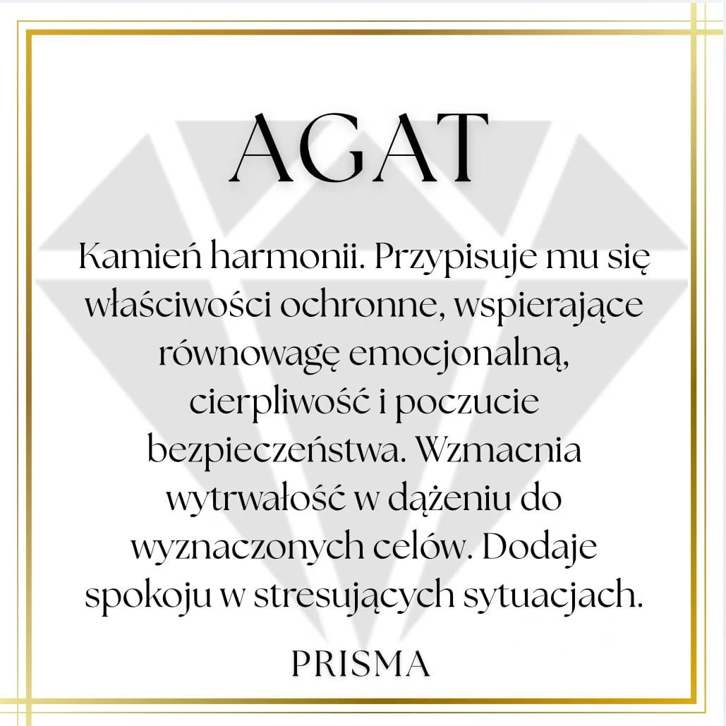 Agat to kamień harmonii. Przypisuje mu się właściwości ochronne, wspierające równowagę emocjonalną, cierpliwość i poczucie bezpieczeństwa. Wzmacnia wytrwałość w dążeniu do wyznaczonych celów. Dodaje spokoju w stresujących sytuacjach.