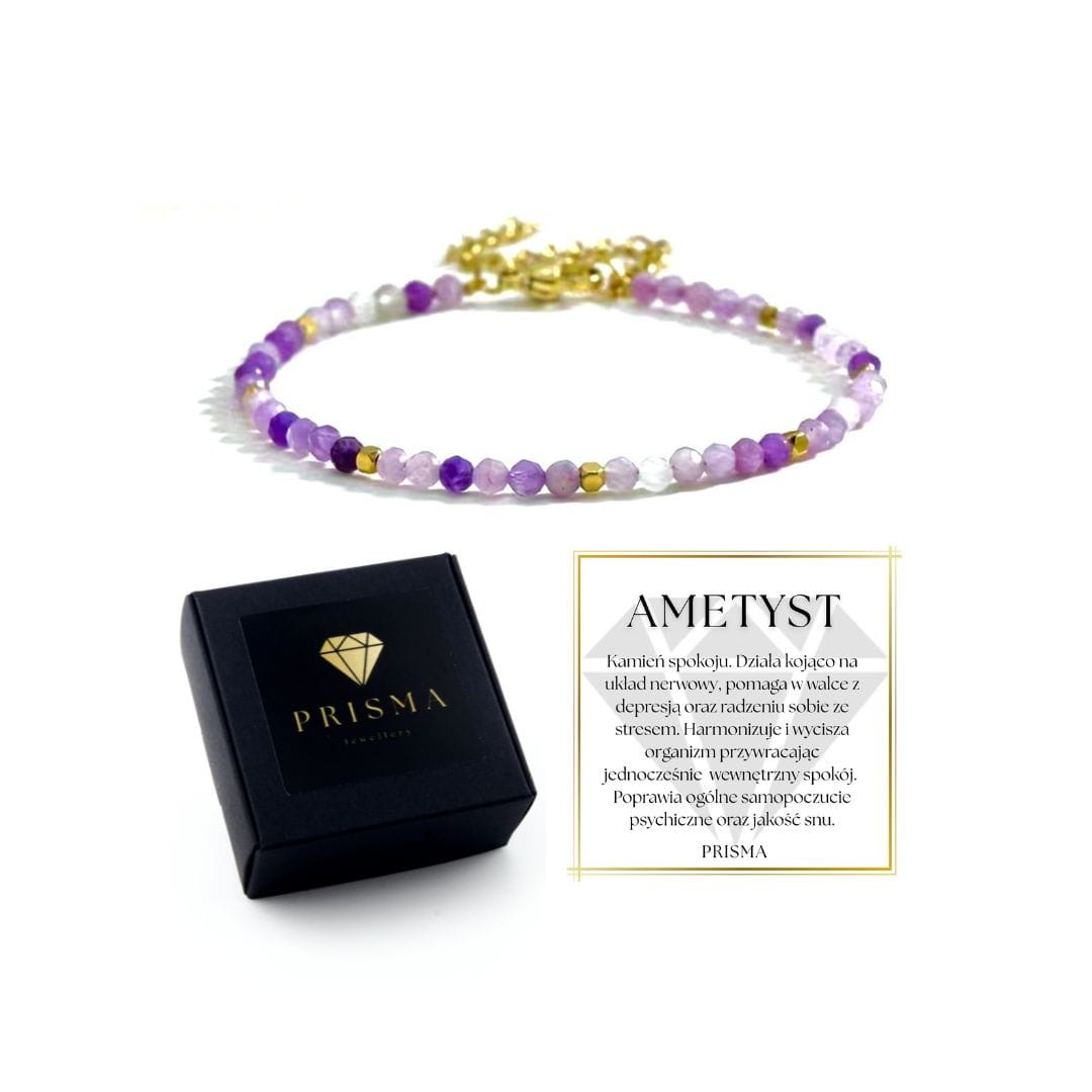 Ametyst to kamień spokoju. Działa kojąco na układ nerwowy, pomaga w walce z depresją oraz radzeniu sobie ze stresem. Harmonizuje i wycisza organizm przywracając jednocześnie wewnętrzny spokój. Poprawia ogólne samopoczucie psychiczne oraz jakość snu.