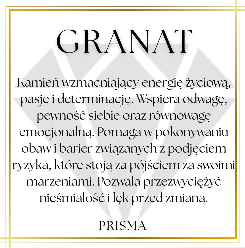 Granat to kamień wzmacniający energię życiową, pasję i determinację. Wspiera odwagę, pewność siebie oraz równowagę emocjonalną. Pomaga w pokonywaniu obaw i barier związanych z podjęciem ryzyka, które stoją za pójściem za swoimi marzeniami. Pozwala przezwyciężyć nieśmiałość i lęk przed zmianą.