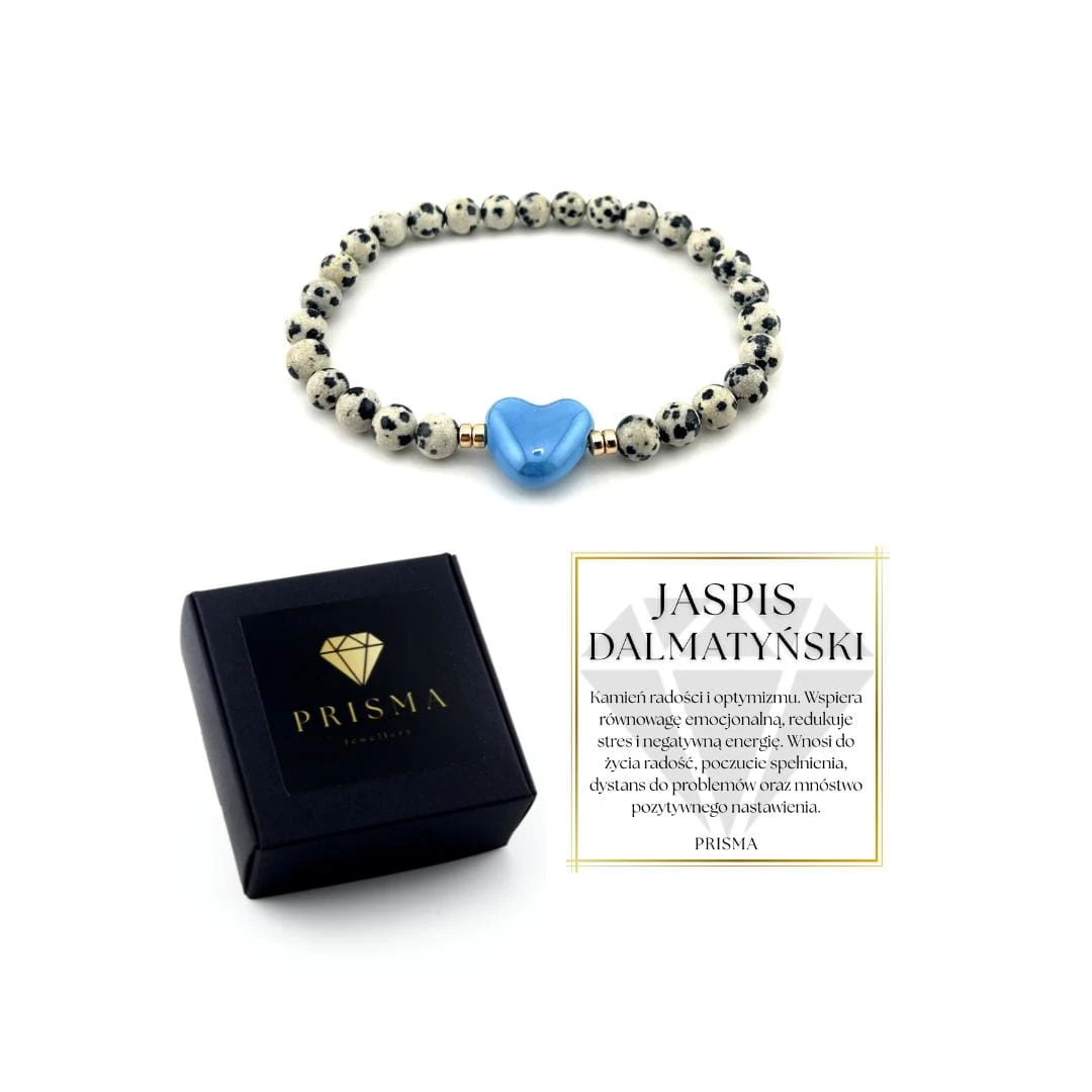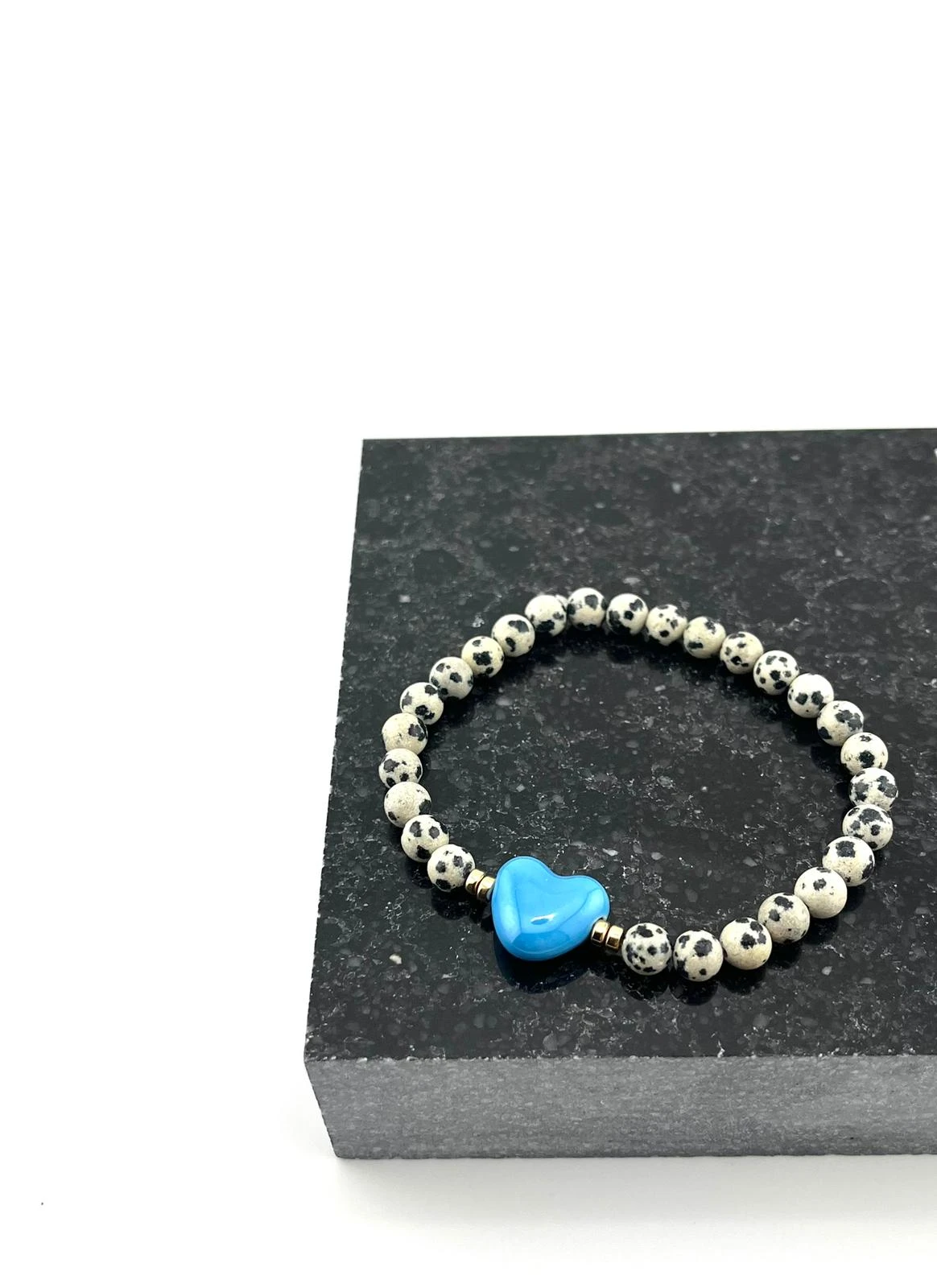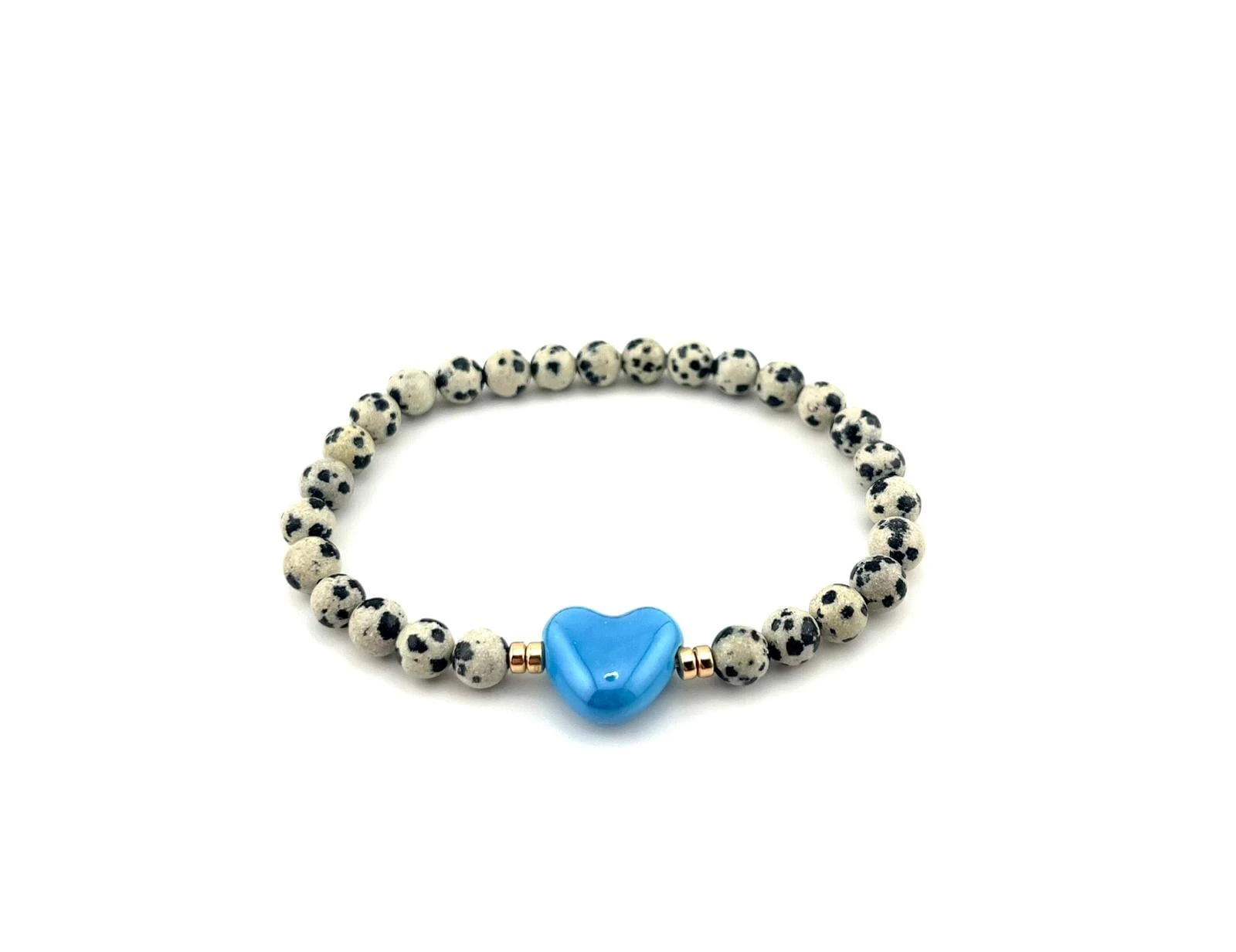 Elegancka i wyjątkowa bransoletka wykonana z naturalnych kamieni jaspisu dalmatyńskiego, ozdobiona subtelnym porcelanowym sercem. To idealny dodatek dla osób ceniących naturalne materiały, delikatną elegancję oraz unikalną biżuterię.