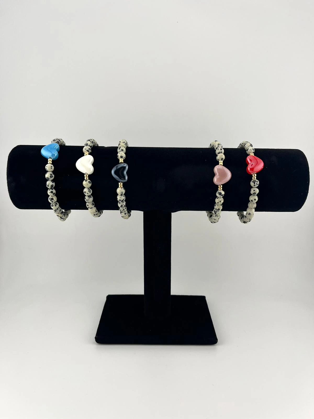 BRANSOLETKA Z JASPISU DALMATYŃSKIEGO Z PORCELANOWYM SERCEM