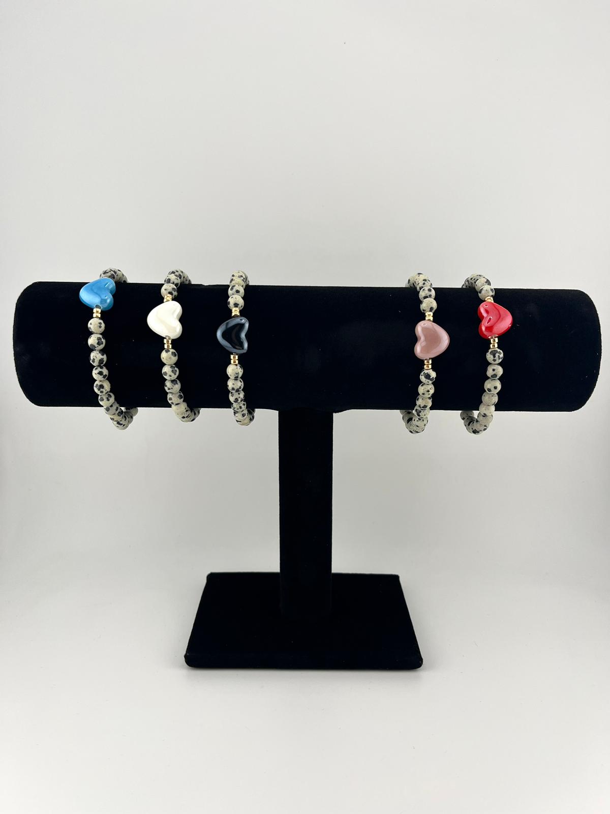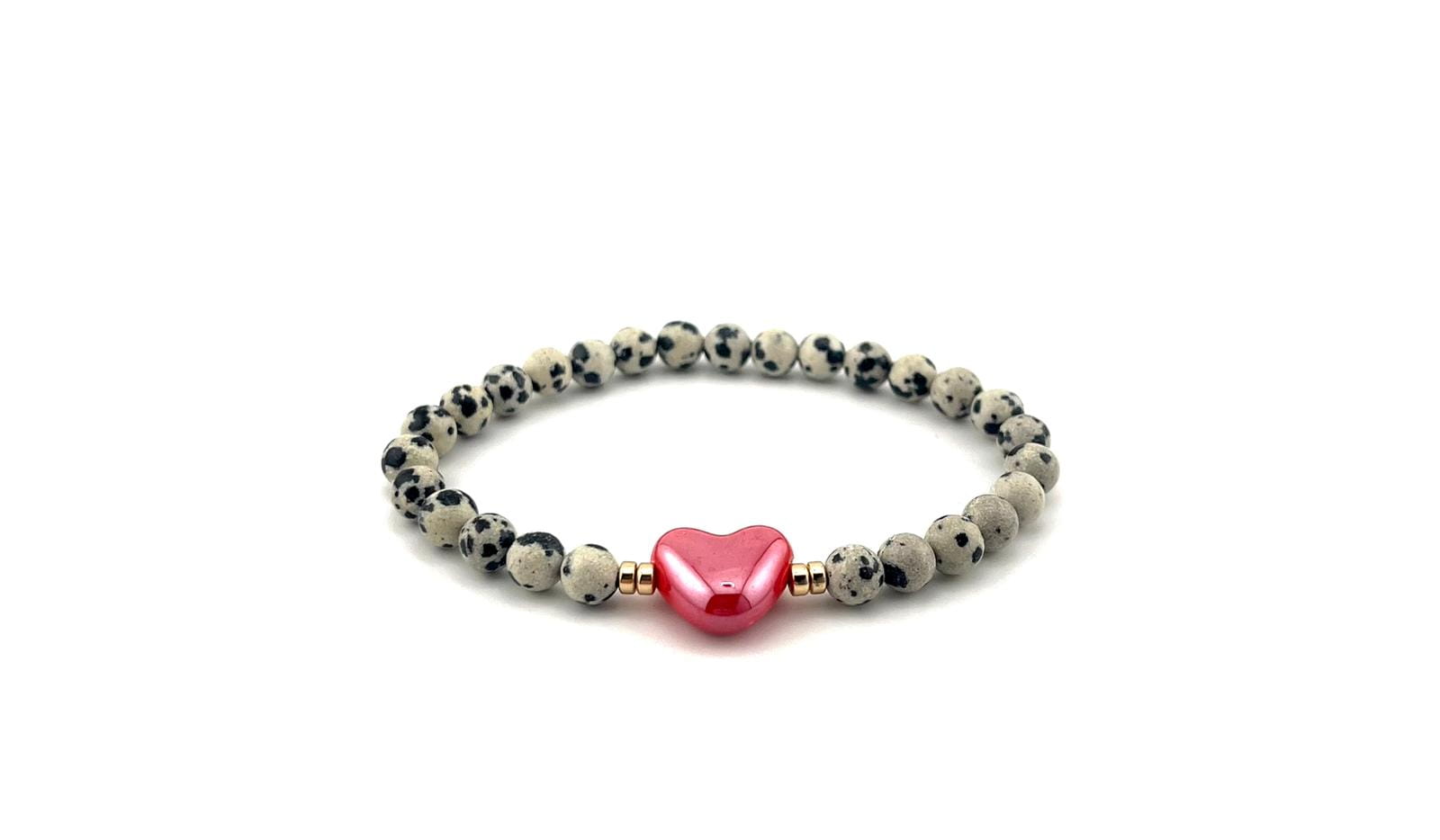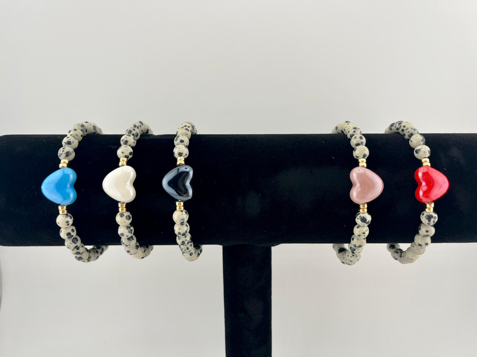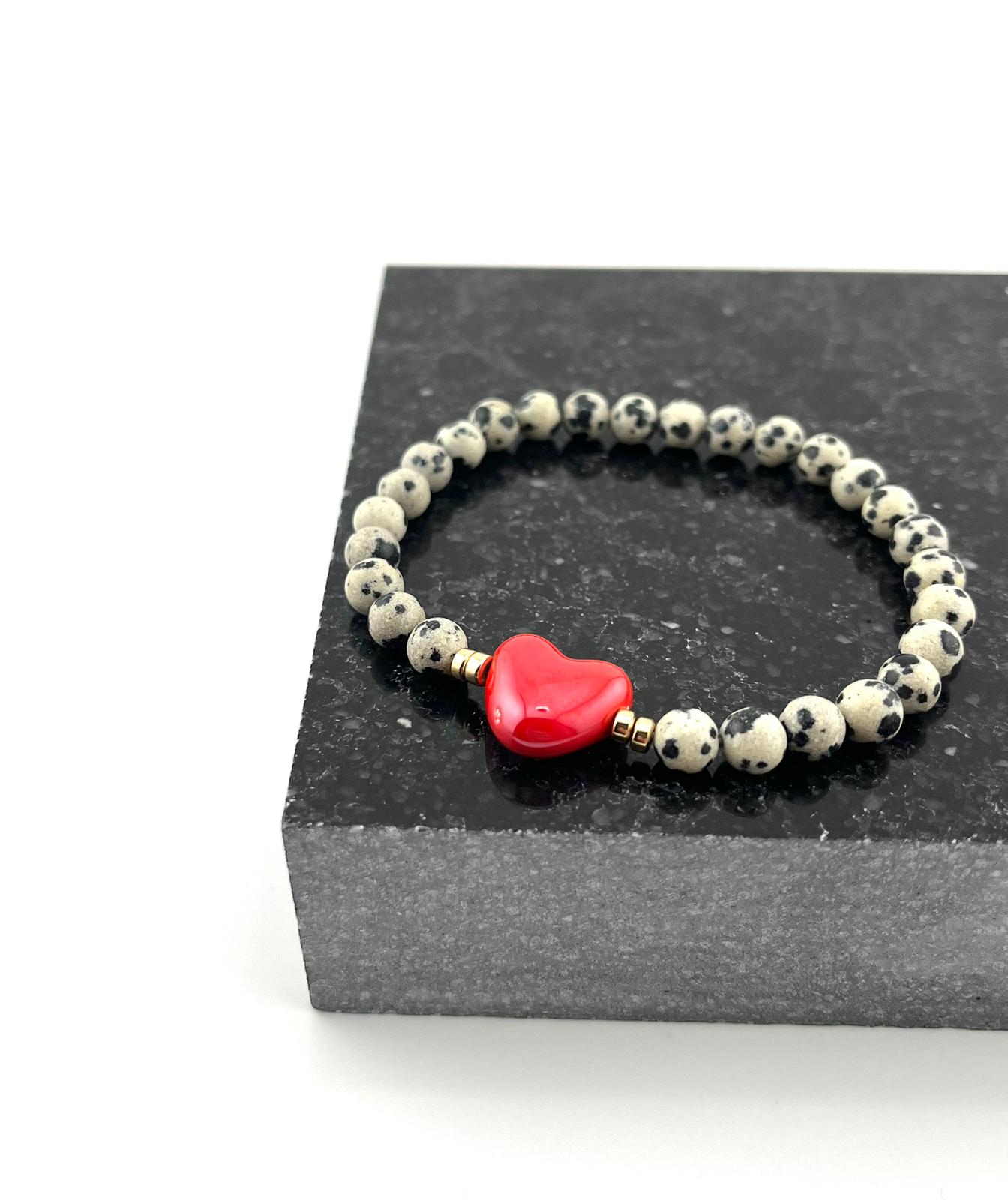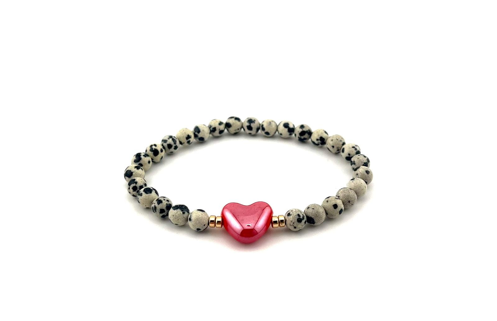Elegancka i wyjątkowa bransoletka wykonana z naturalnych kamieni jaspisu dalmatyńskiego, ozdobiona subtelnym porcelanowym sercem. To idealny dodatek dla osób ceniących naturalne materiały, delikatną elegancję oraz unikalną biżuterię.
