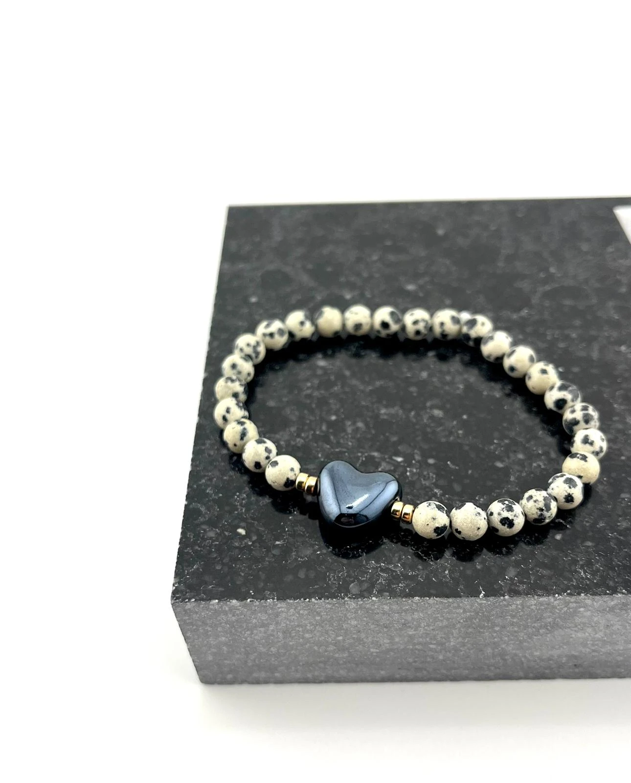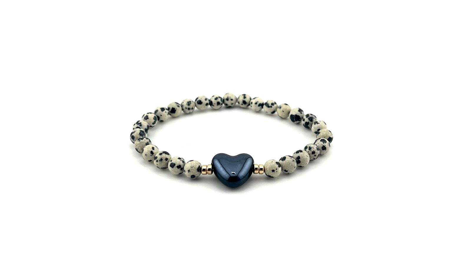 Elegancka i wyjątkowa bransoletka wykonana z naturalnych kamieni jaspisu dalmatyńskiego, ozdobiona subtelnym porcelanowym sercem. To idealny dodatek dla osób ceniących naturalne materiały, delikatną elegancję oraz unikalną biżuterię.