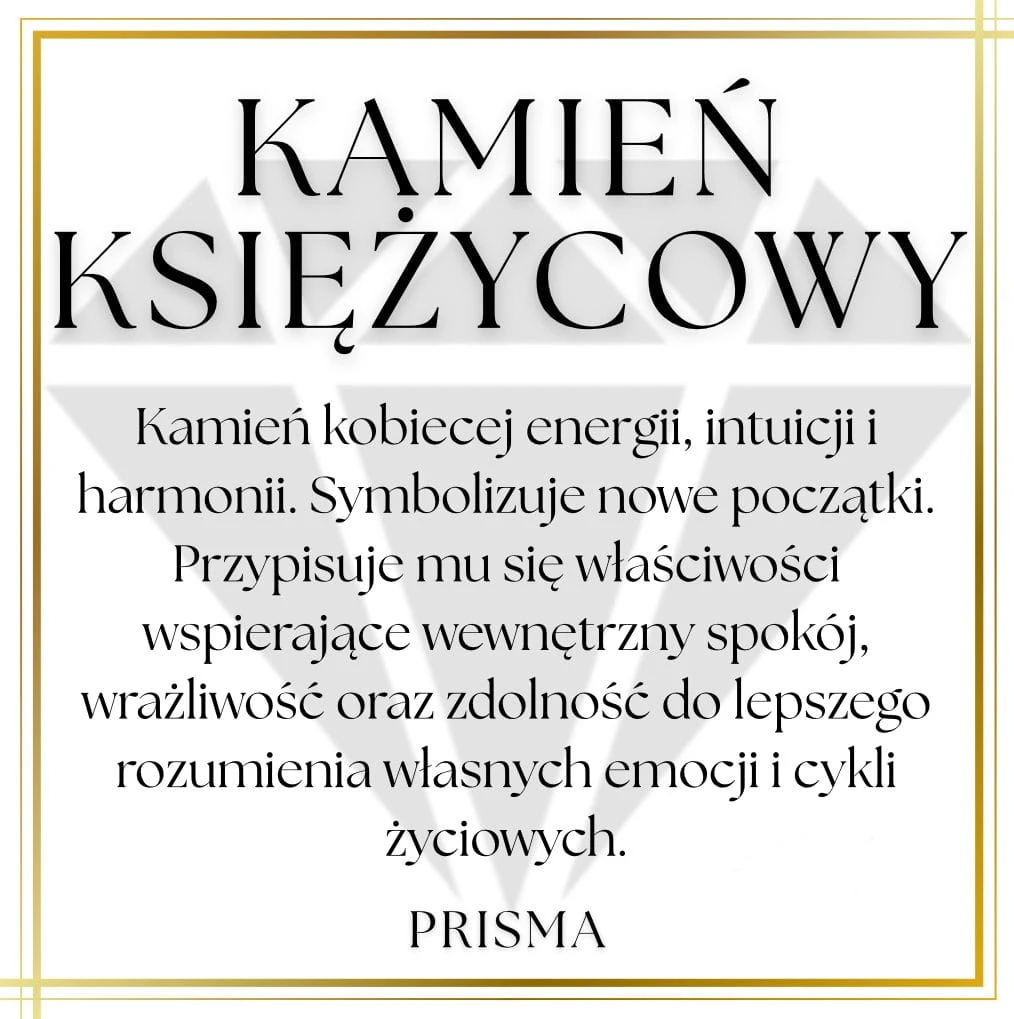 Kamień księżycowy to kamień kobiecej energii, intuicji i harmonii. Symbolizuje nowe początki. Przypisuje mu się właściwości wspierające wewnętrzny spokój, wrażliwość oraz zdolność do lepszego rozumienia własnych emocji i cykli życiowych.