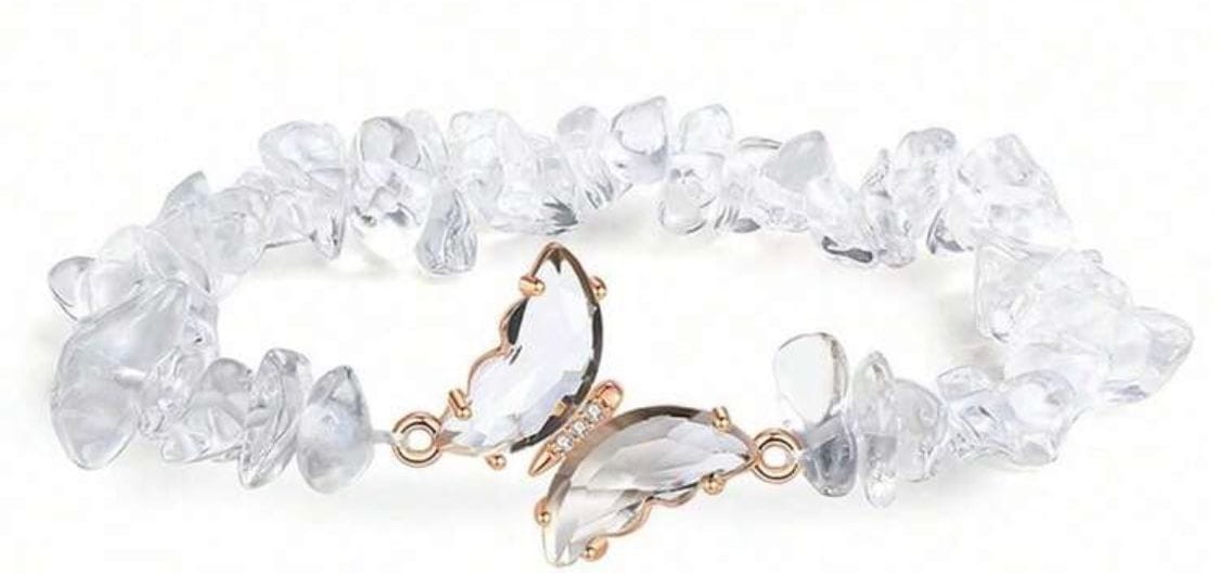✨ Elegancka i wyjątkowa bransoletka wykonana z naturalnych kamieni kryształu górskiego, ozdobiona subtelnym motylem. To idealny dodatek dla osób ceniących naturalne materiały, elegancję oraz unikalną biżuterię.