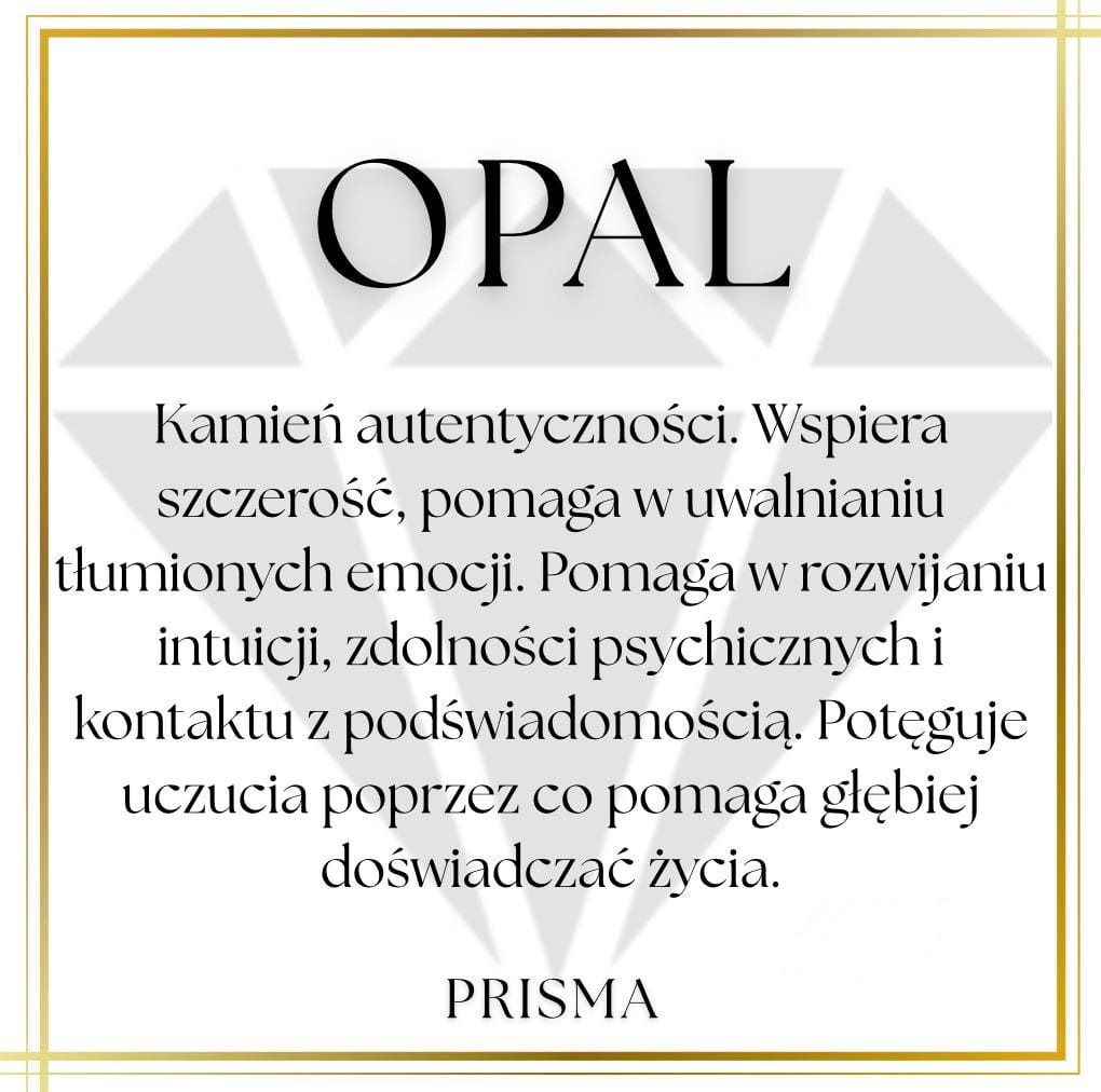 Opal to kamień autentyczności. Wspiera szczerość, pomaga w uwalnianiu tłumionych emocji. Pomaga w rozwijaniu intuicji, zdolności psychicznych i kontaktu z podświadomością. Potęguje uczucia przez co pomaga głębiej doświadczać życia.