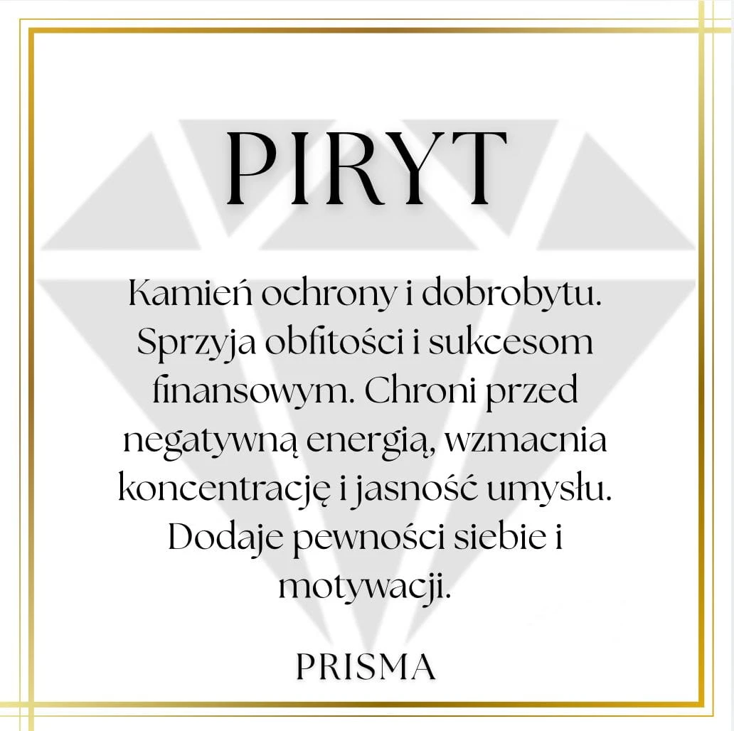 Piryt to kamień ochrony i dobrobytu. Sprzyja obfitości i sukcesom finansowym. Chroni przed negatywną energią, wzmacnia koncentrację i jasność umysłu. Dodaje pewności siebie i motywacji.
