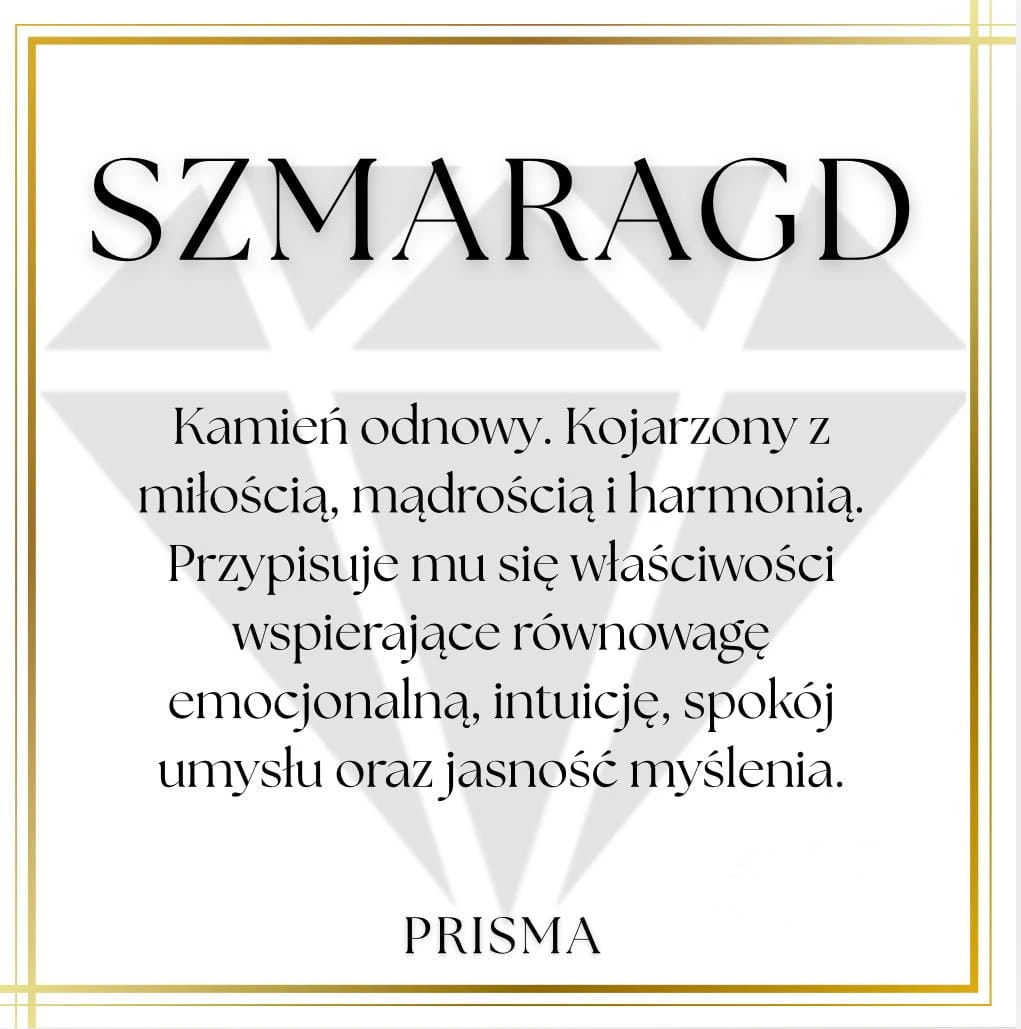 Szmaragd to kamień odnowy. Kojarzony z miłością, mądrością i harmonią. Przypisuje mu się właściwości wspierające równowagę emocjonalną, intuicję, spokój umysłu oraz jasność myślenia.