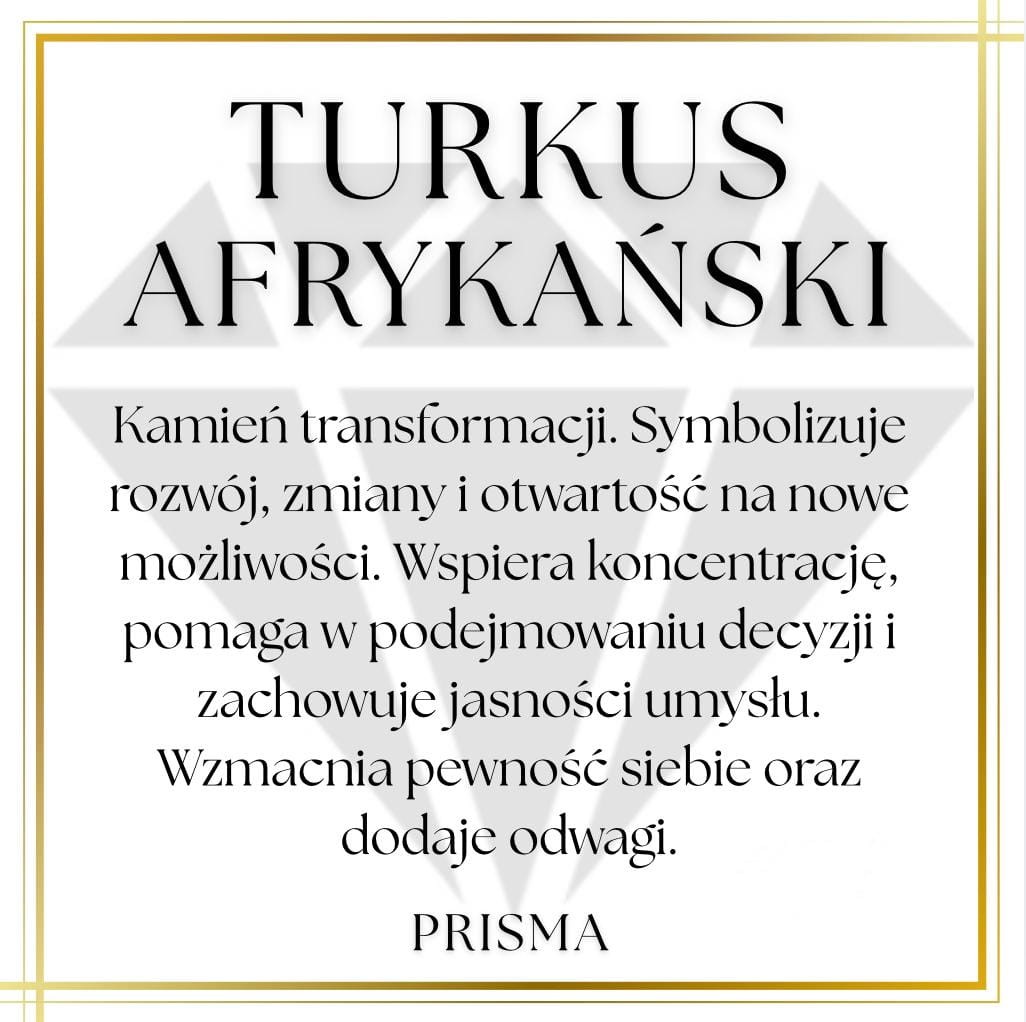 Turkus afrykański to kamień transformacji. Symbolizuje rozwój, zmiany i otwartość na nowe możliwości. Wspiera koncentrację, pomaga w podejmowaniu decyzji i zachowuje jasność umysłu. Wzmacnia pewność siebie oraz dodaje odwagi.