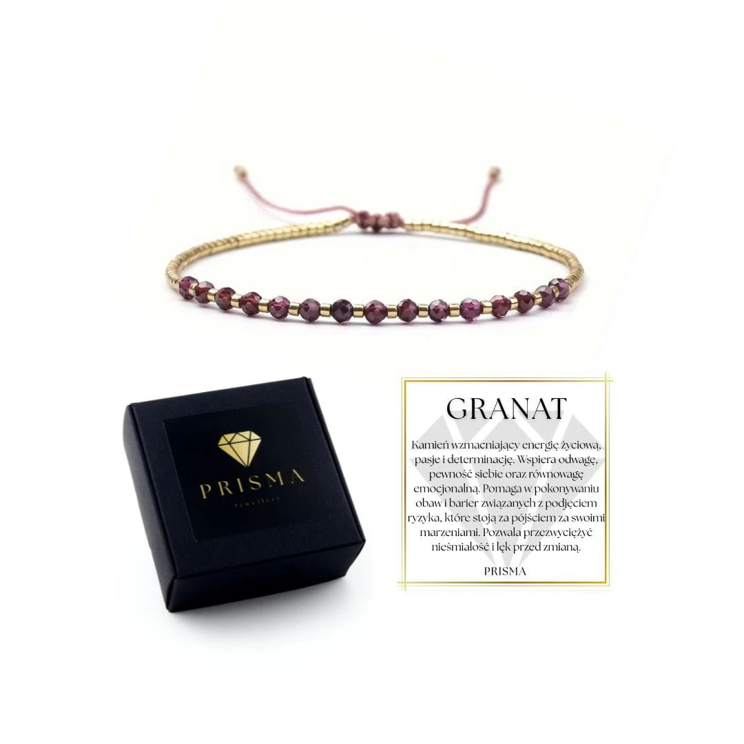 Granat to kamień wzmacniający energię życiową, pasję i determinację. Wspiera odwagę, pewność siebie oraz równowagę emocjonalną. Pomaga w pokonywaniu obaw i barier związanych z podjęciem ryzyka, które stoją za pójściem za swoimi marzeniami. Pozwala przezwyciężyć nieśmiałość i lęk przed zmianą.