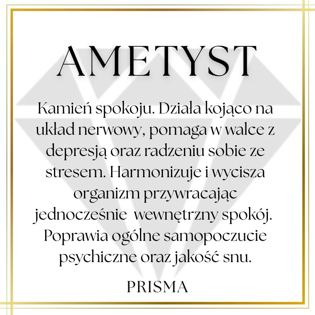 Ametyst to kamień spokoju. Działa kojąco na układ nerwowy, pomaga w walce z depresją oraz radzeniu sobie ze stresem. Harmonizuje i wycisza organizm przywracając jednocześnie wewnętrzny spokój. Poprawia ogólne samopoczucie psychiczne oraz jakość snu.
