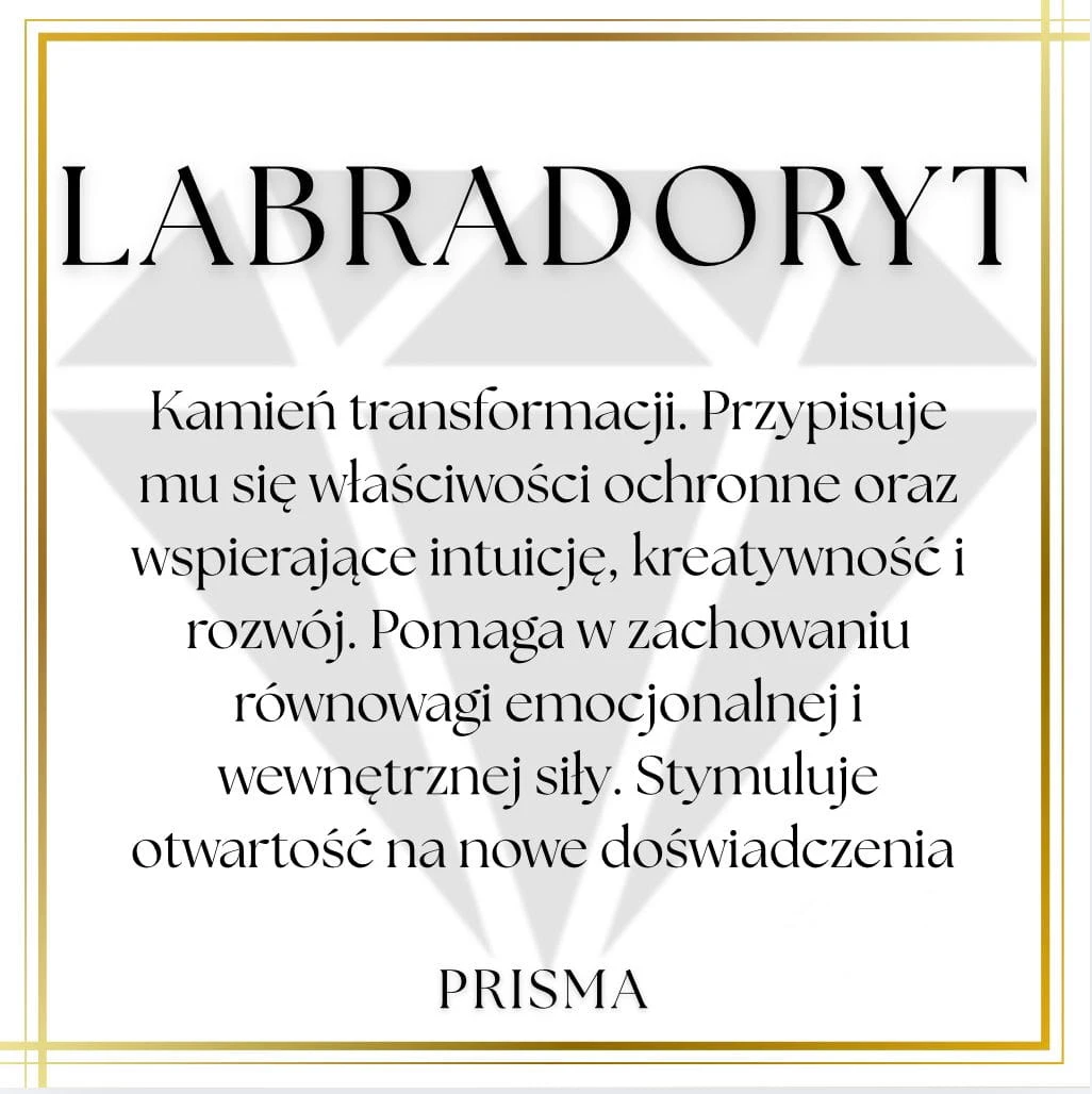 Labradoryt to kamień transformacji. Przypisuje mu się właściwości ochronne oraz wspierające intuicję, kreatywność i rozwój. Pomaga w zachowaniu równowagi emocjonalnej i wewnętrznej siły. Stymuluje otwartość na nowe doświadczenia.