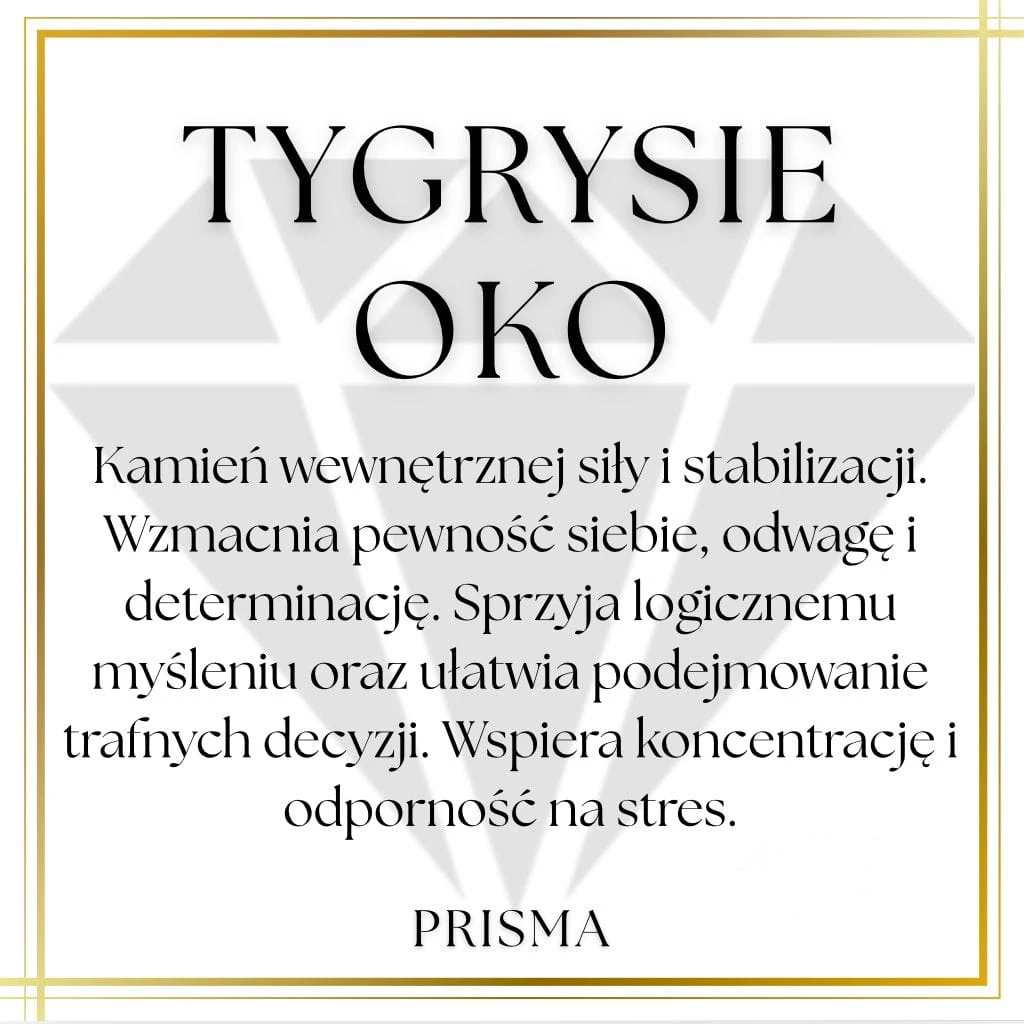 Tygrysie oko to kamień wewnętrznej siły i stabilizacji. Wzmacnia pewność siebie, odwagę i determinację. Sprzyja logicznemu myśleniu oraz ułatwia podejmowanie decyzji. Wspiera koncentrację i odporność na stres.